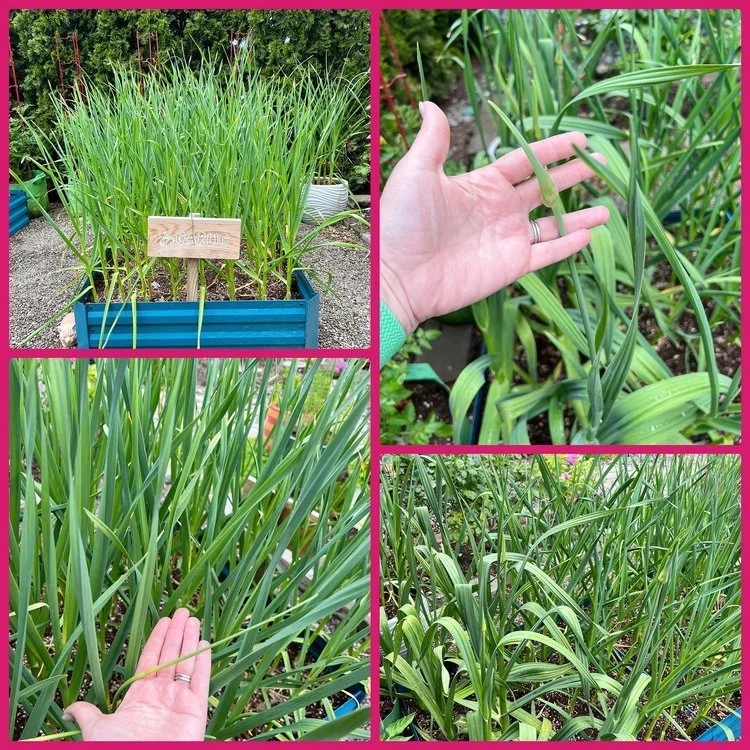 Some folks harvest the scapes once they’ve formed, which are yummy and allow the plant to put a little more energy into a slightly bigger bulb. However, I leave most of my scapes as the bees absolutely love the flowers!